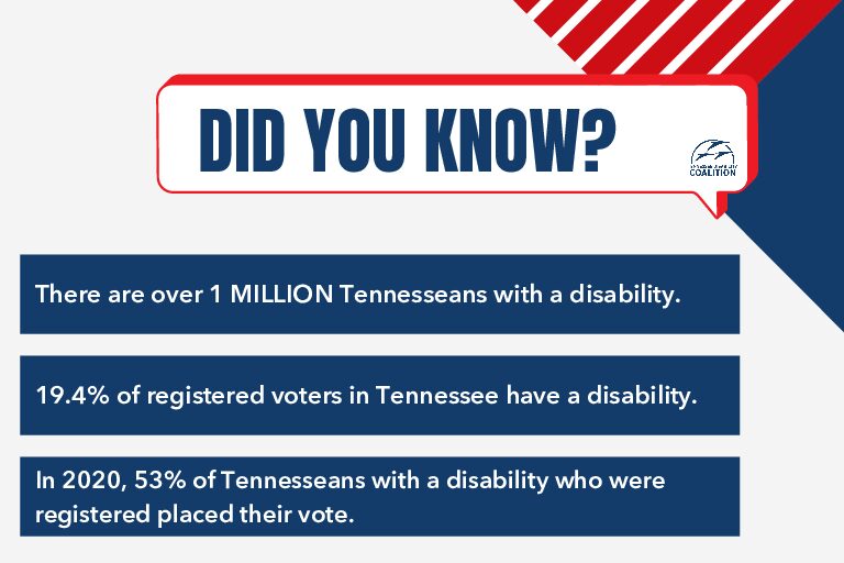 The Tennessee Disability Coalition partnered with the Tennessee Secretary of State and Disability Rights Tennessee to develop a brief video demonstrating an accessible polling place and voting process for Tennesseans with all types of disabilities. This video is a resource for election officials, pollworkers, and the disability community. There are over one million people in Tennessee living with a disability and when we arrive on Election Day to vote, we want what every other voter wants- the ability to cast our ballot privately and independently.
