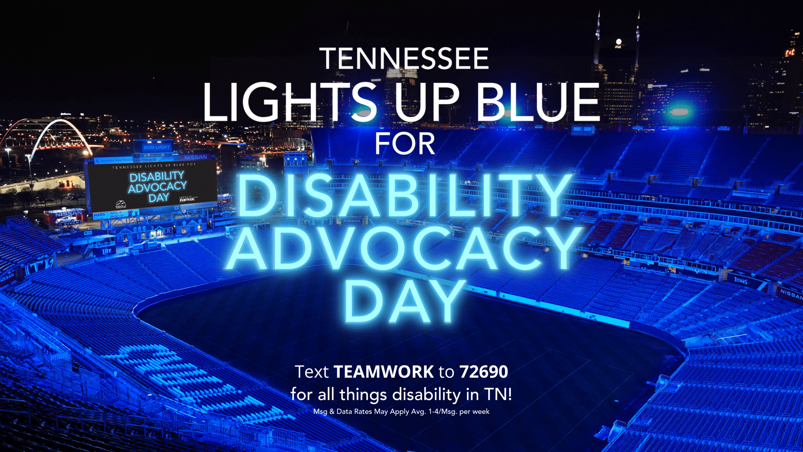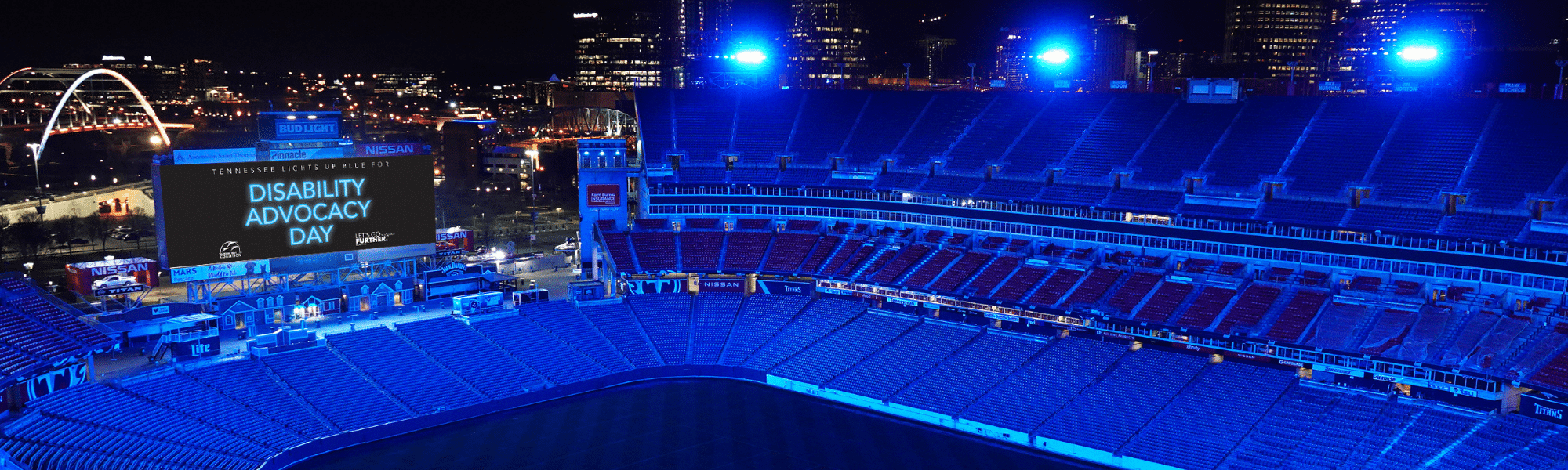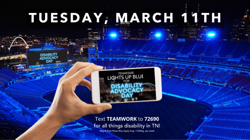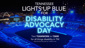 Alt-Text: Picture of Nissan Stadium lit up blue. Text reads “Tennessee Lights Up Blue for Disability Advocacy Day. Text ‘teamwork’ to 72690 for all things disability in TN! Msg. & data rates may apply. Average 1-4/msg. per week”