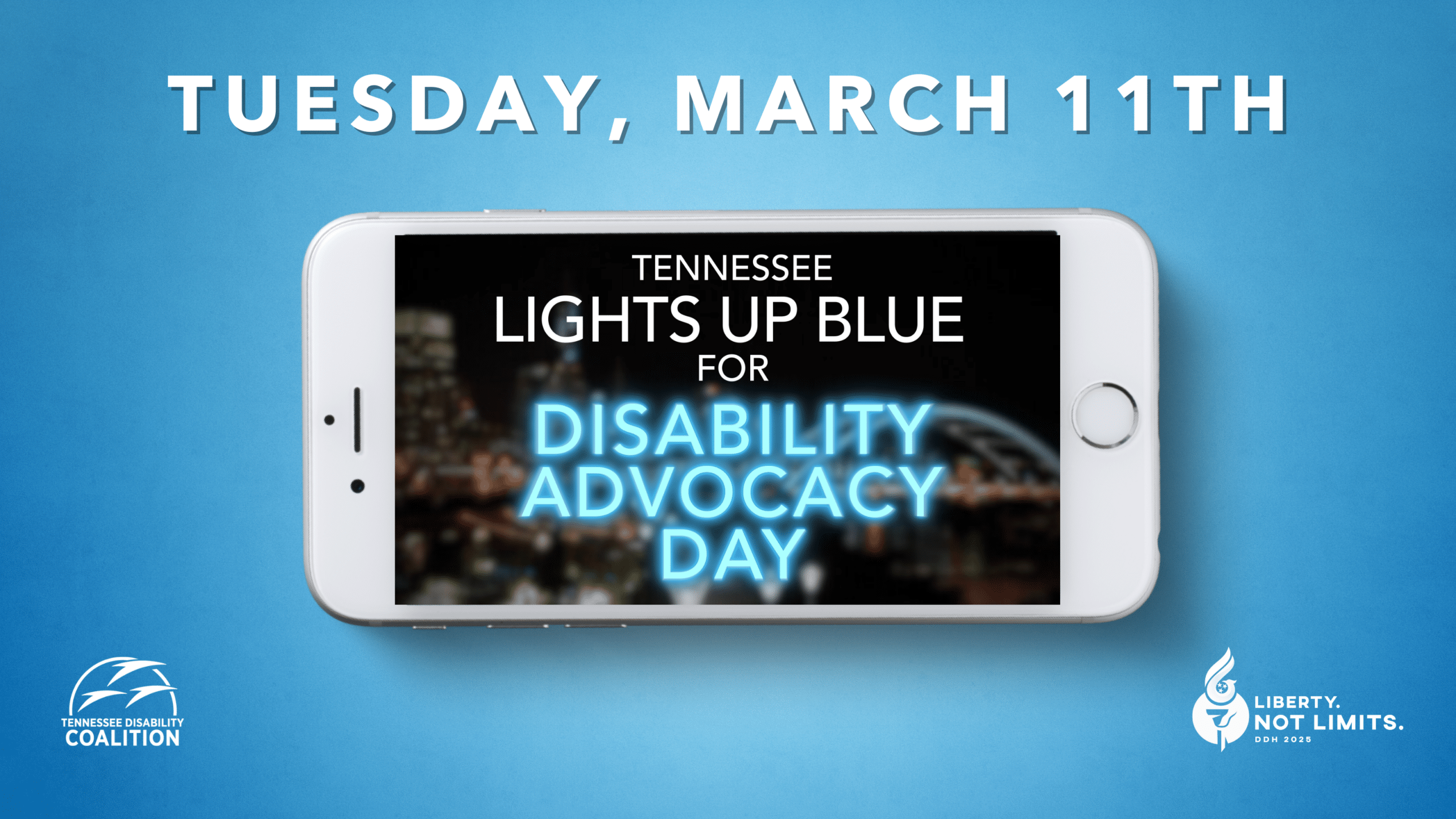 Alt-text: blue background with a white phone opened to a graphic that reads “Tennessee Lights Up Blue for Disability Advocacy Day. Tuesday, March 11th.”