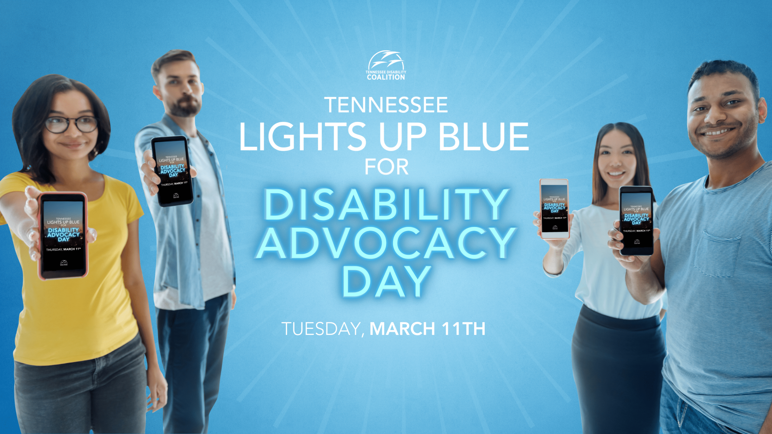 Alt-text: blue background with people holding their phones up. Text reads “Tennessee Lights Up Blue for Disability Advocacy Day. Tuesday, March 11th.”