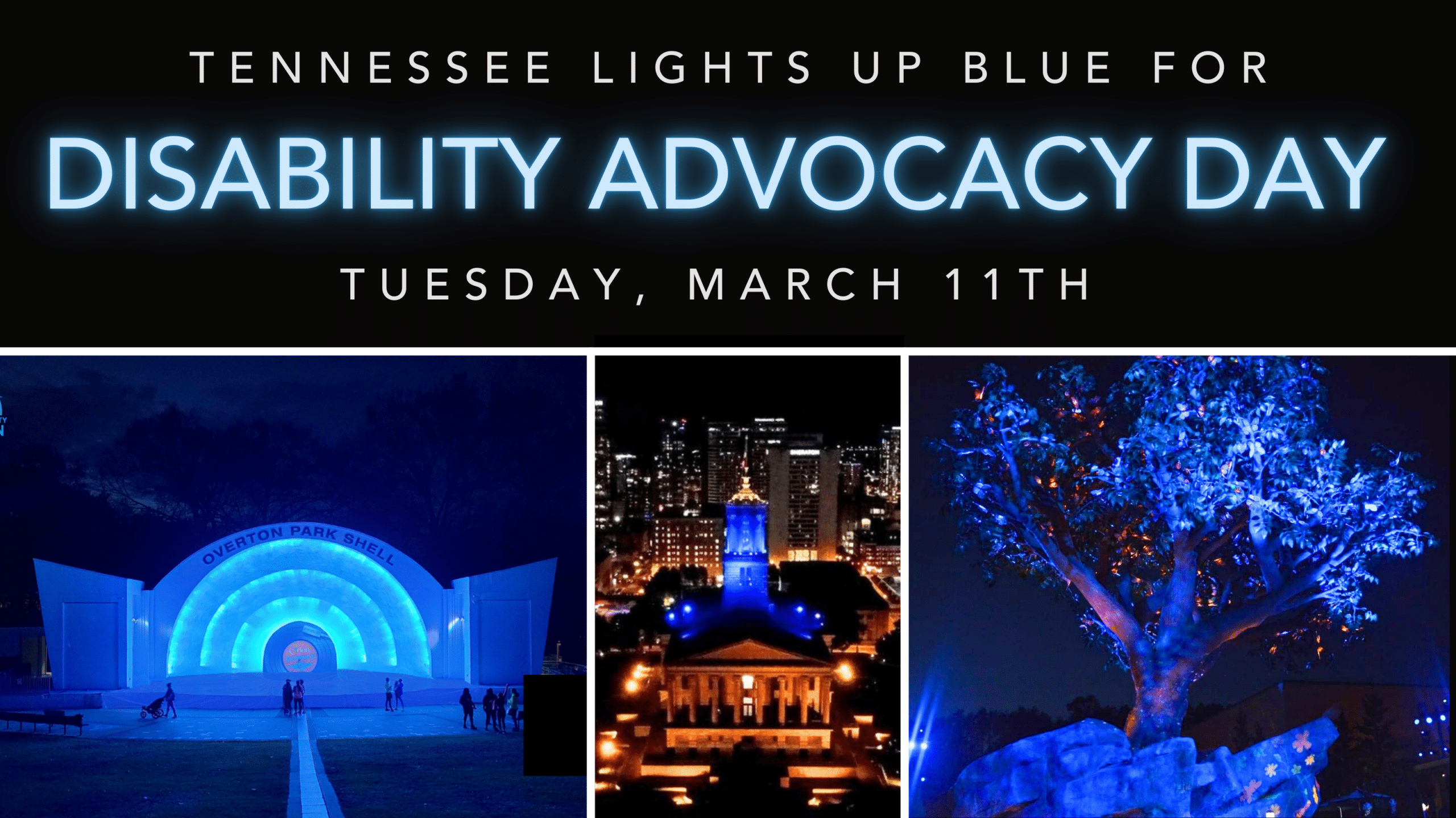 Alt-text: Pictures of Tennessee landmarks lit up blue. Text reads “Tennessee Lights Up Blue for Disability Advocacy Day. Tuesday, March 11th.”