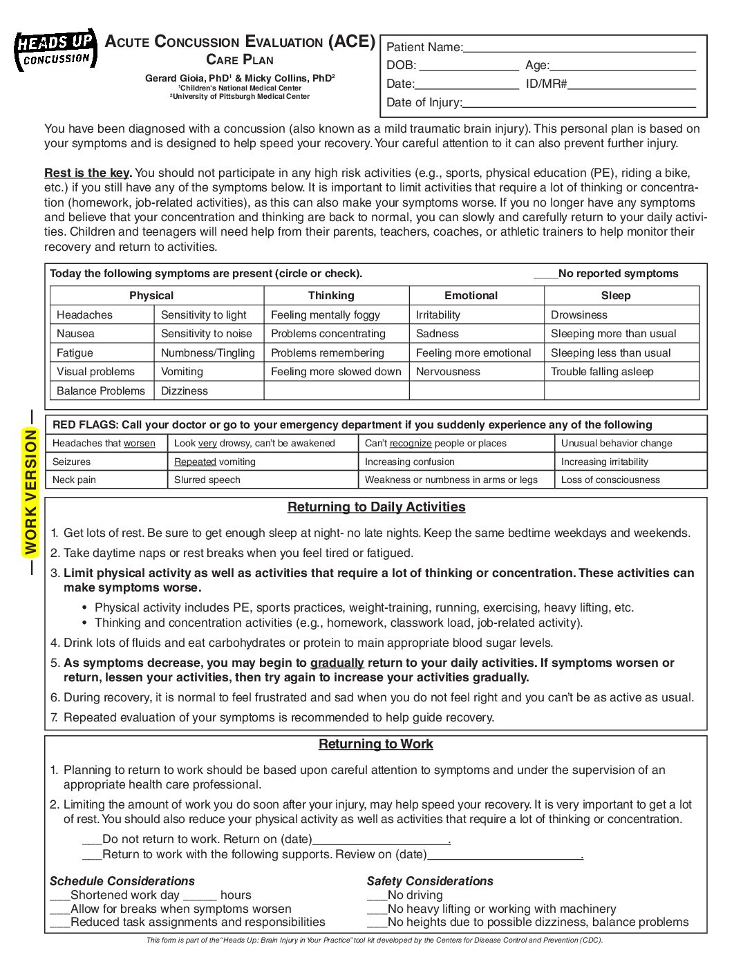 Acute Concussion Evaluation (ACE) Tools: ACE Care Plan – Return to Work