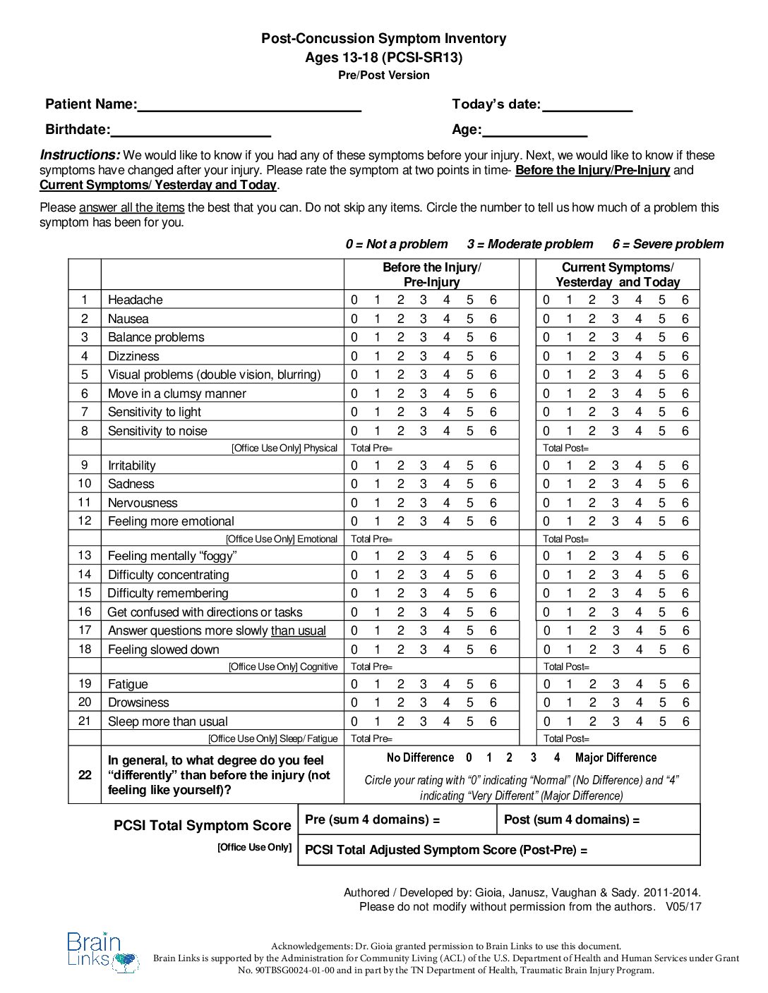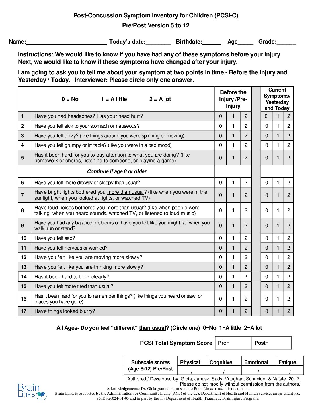 Post Concussion Symptom Inventories (PCSI): Child 5-12