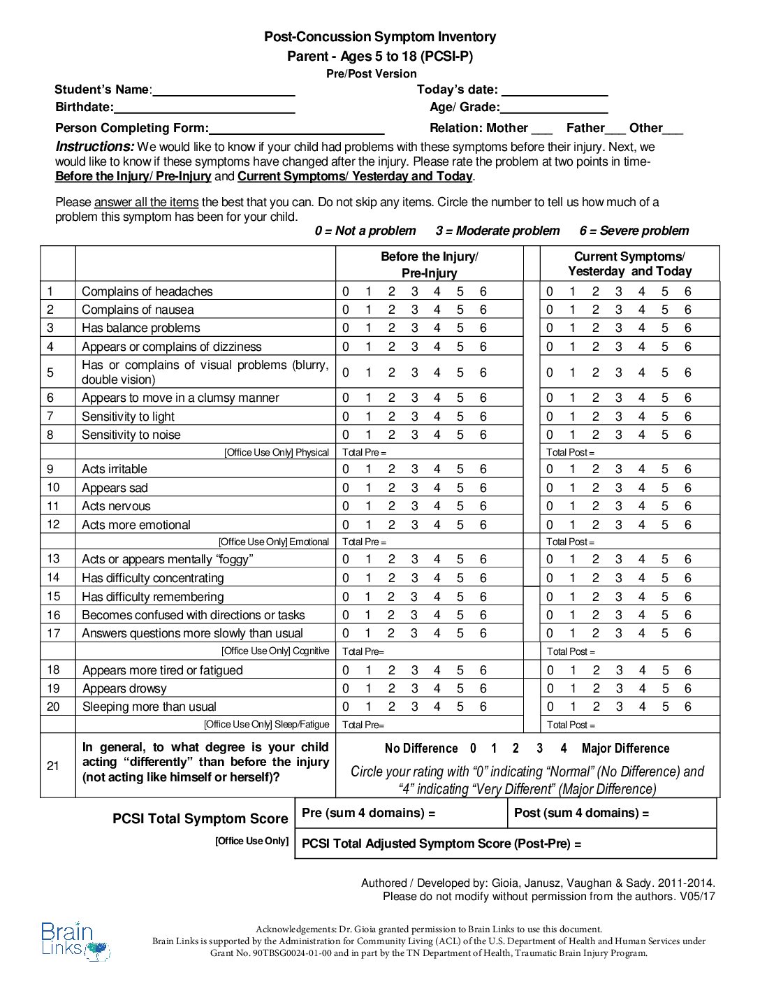 Post Concussion Symptom Inventories (PCSI): Parent 5-18 Pre-Post Injury